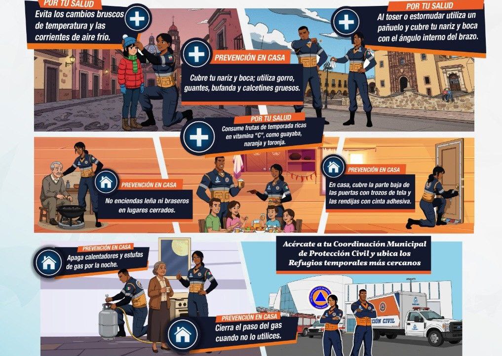 La Coordinación Estatal de Protección Civil exhorta a la población a mantenerse abrigados dentro y fuera de las viviendas o lugares de trabajo, usar ropa como guantes, y gorro, consumir frutas y verduras ricas en vitamina C y cubrir nariz y boca.