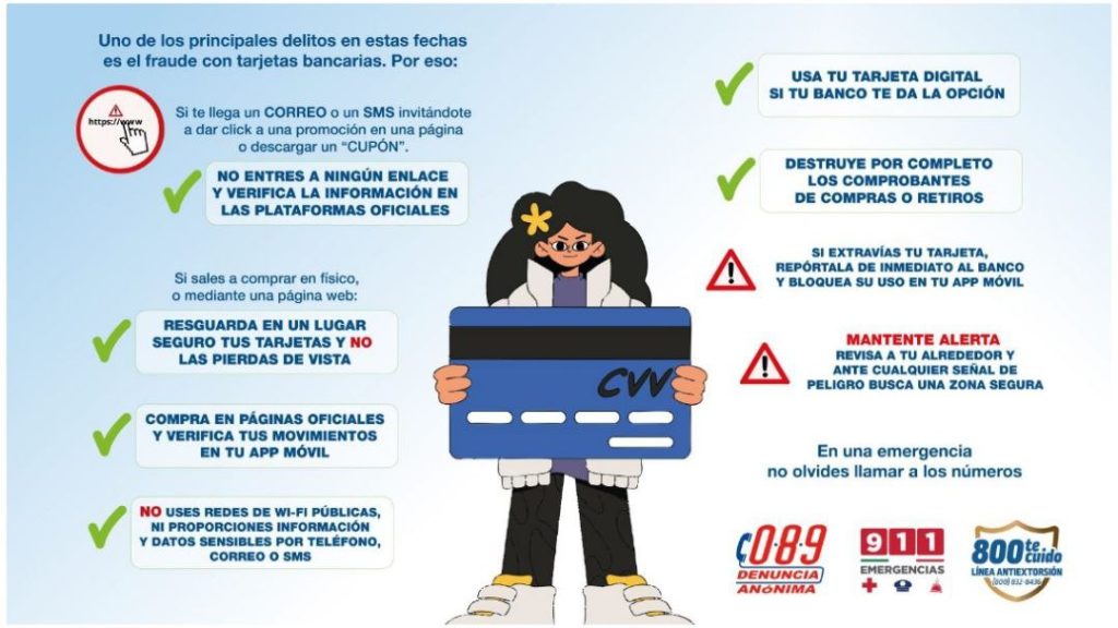 Recuerda que tener estas precauciones pueden evitar que seas víctima de este tipo de delitos durante el Buen Fin, y ante cualquier emergencia puede ser reportada el 911, al teléfono directo y anónimo 089 así como también la línea 800- TECUIDO (8328436).