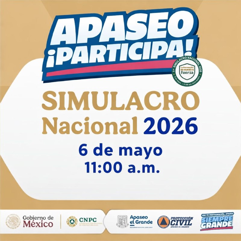 Apaseo el Grande, Gto., a 27 de abril de 2026.- Con el objetivo de fortalecer la cultura de la prevención y mejorar la capacidad de respuesta ante emergencias, el municipio de Apaseo el Grande participará en el Primer Simulacro Nacional 2026, que se realizará el próximo 6 de mayo a las 11:00 de la mañana.
