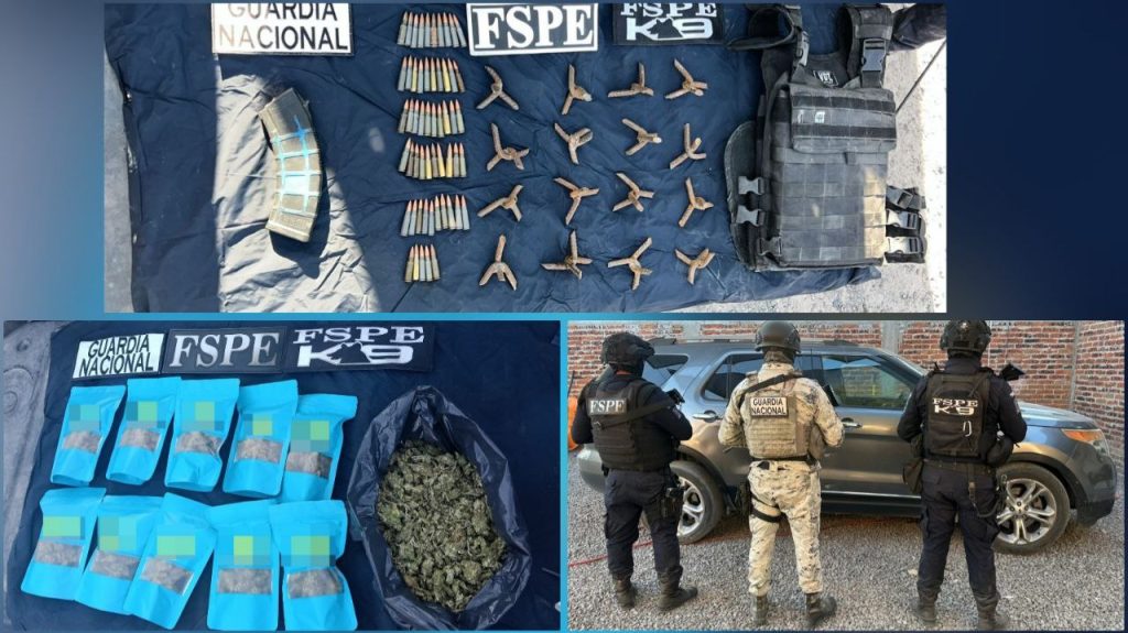 Aseguran FSPE y Guardia Nacional droga, municiones y equipo táctico en Santa Rosa de Lima, Villagrán