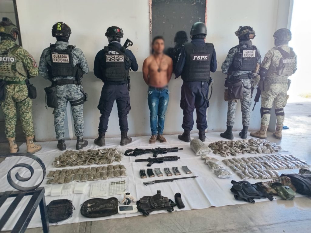 Con apoyo de la Guardia Nacional, los oficiales lograron detener al hombre metros adelante sin poner en riesgo a la ciudadanía. Durante la revisión se localizaron dos armas largas, cargadores y cartuchos de distintos calibres, equipo táctico y 7.9 kilogramos de marihuana, equivalente a 7 mil 970 dosis.