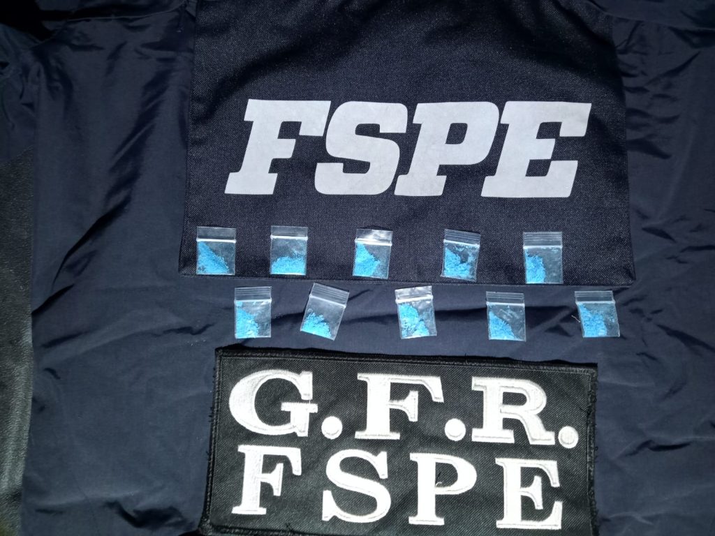 Tras una inspección preventiva, se le aseguraron 10 bolsas plásticas con una sustancia granulada con las características del cristal, equivalente a 10 dosis.