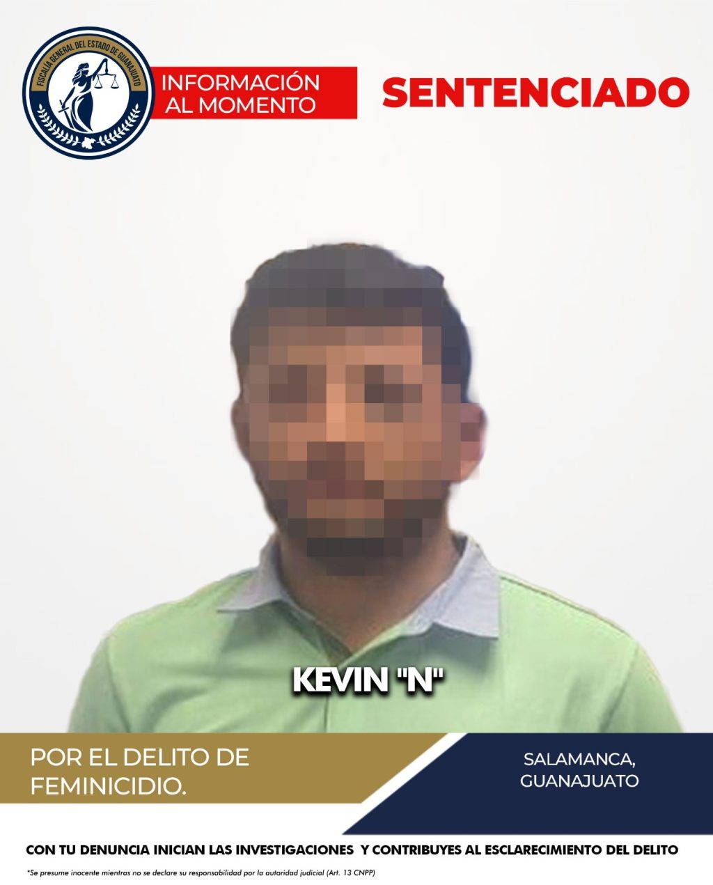 La Fiscalía General del Estado de Guanajuato informa a la ciudadanía que, como resultado del trabajo de investigación y la exposición de datos de prueba ante un Tribunal de Enjuiciamiento, se obtuvo una sentencia condenatoria de 37 años de prisión en contra de KEVIN “N”,declarado responsable del delito de feminicidio, ocurrido en el municipio de Salamanca en el año 2024.