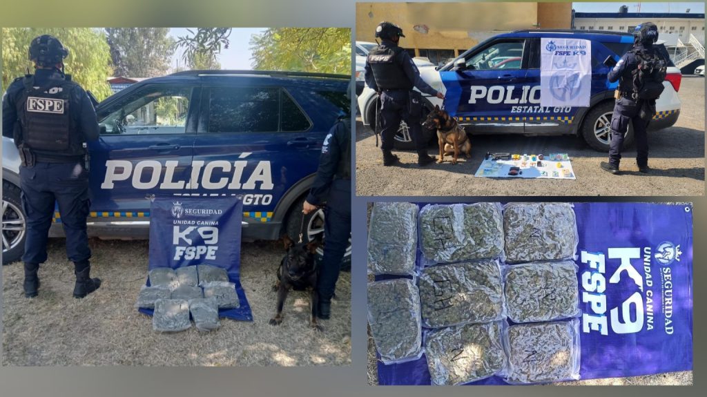 El segundo hecho se registró en el municipio de León, tras revisiones en una empresa de mensajería ubicada en la colonia Industrial Delta. En el sitio, el oficial canino Polly marcó como positivo un paquete que contenía ocho bolsas selladas al vacío con hierba verde y seca con características de marihuana, equivalente a 4 mil 174 dosis aproximadamente.