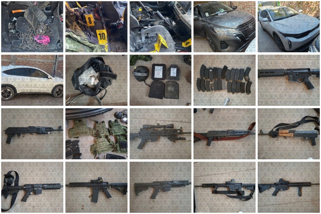 Al interior del inmueble fue detenida una mujer identificada como JAZMÍN “N”, quien quedó a disposición del Ministerio Público. Dentro del domicilio se aseguraron 10 armas largas, vehículos con reporte de robo, equipo táctico, poncha llantas, cargadores y cartuchos reservados para uso exclusivo de la Fuerza Armada Permanente, entre otros objetos, por lo que, el Ministerio Público formuló imputación por los delitos de robo equiparado, acopio de armas prohibidas, posesión de cartuchos y cargadores de uso exclusivo de la Fuerza Armada Permanente, así como acopio de armas de fuego de uso exclusivo.