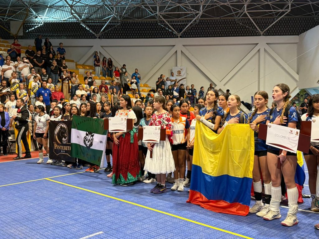 Posteriormente, se entonaron los himnos nacionales de Colombia y México. Se aprovecho la oportunidad y el marco de esta inauguración para hacer entrega de reconocimientos a Ana María Huaracha Torres, una destacada deportista y entrenadora, además de promotora e impulsora del voleibol en el estado.