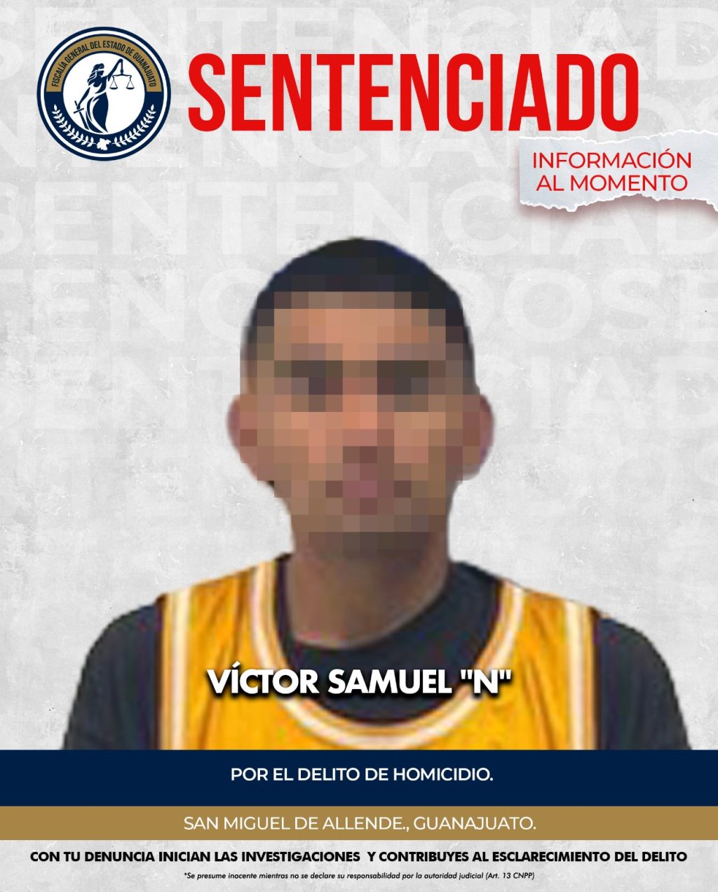Durante el desarrollo de una audiencia judicial presidida por una Jueza, la Fiscalía General del Estado logró que se dictara una sentencia de condena en contra de VÍCTOR SAMUEL “N”, al demostrarse su responsabilidad en el delito de homicidio ocurrido en este San Miguel de Allende.
