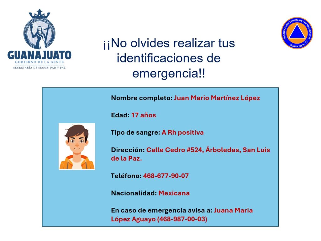 Realiza identificaciones de emergencia de cada miembro de la familia, en donde especifiques tipo sanguíneo y un contacto de emergencia, además de tu nombre completo y nacionalidad.