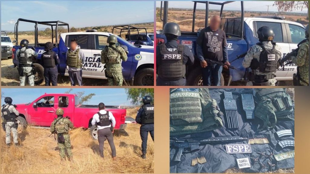 Durante la intervención se aseguró un arma larga tipo fusil, cargadores y cartuchos útiles, así como equipo táctico, un inhibidor de señal, estrellas ponchallantas y un vehículo tipo pick up, marca Chevrolet, color rojo, sin placas de circulación. Todos los indicios quedaron a disposición de la Fiscalía General de la República (FGR), con sede en Celaya.