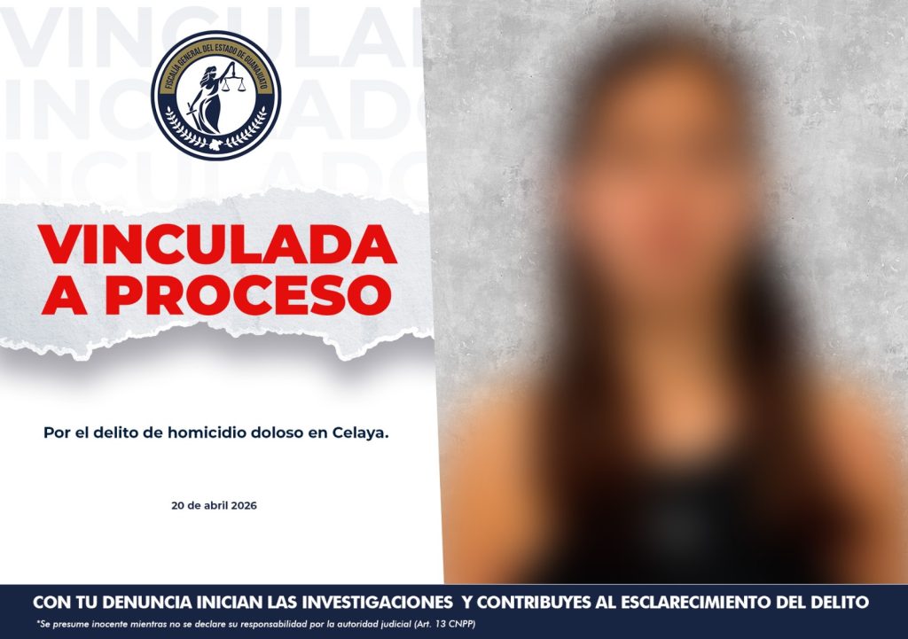 La Fiscalía General del Estado de Guanajuato informa que, tras la reanudación de la audiencia inicial por los hechos ocurridos el 12 de abril de 2026, en el bulevar Adolfo López Mateos, en el municipio de Celaya, el agente del Ministerio Público obtuvo de un Juez la vinculación a proceso penal en contra de PALOMA “N” por el delito de homicidio doloso.