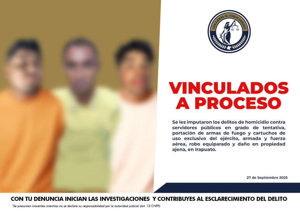 La Fiscalía General del Estado de Guanajuato recabó pruebas y obtuvo que tres presuntos criminales permanezcan en prisión, acusados de intentar asesinar a más de una decena de elementos de seguridad del ámbito estatal y federal, en el municipio de Irapuato.PEDRO “N”, AARÓN “N” y RAFAEL “N” han sido vinculados a proceso penal por homicidio cometido en contra de servidor público en grado de tentativa, en agravio de seis elementos de las Fuerzas de Seguridad y Paz del Estado y homicidio calificado en grado de tentativa, en agravio de once elementos de la Guardia Nacional. Además de daño en propiedad ajena, en agravio de esta última corporación; así como portación de armas de fuego y cartuchos de uso exclusivo del Ejército, Armada y Fuerza Aérea.